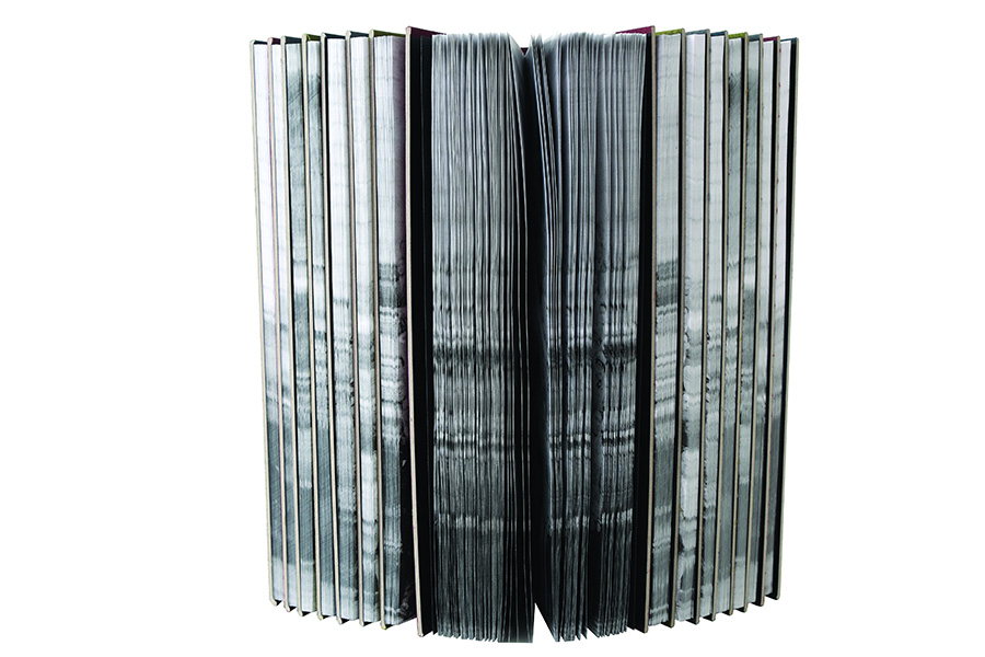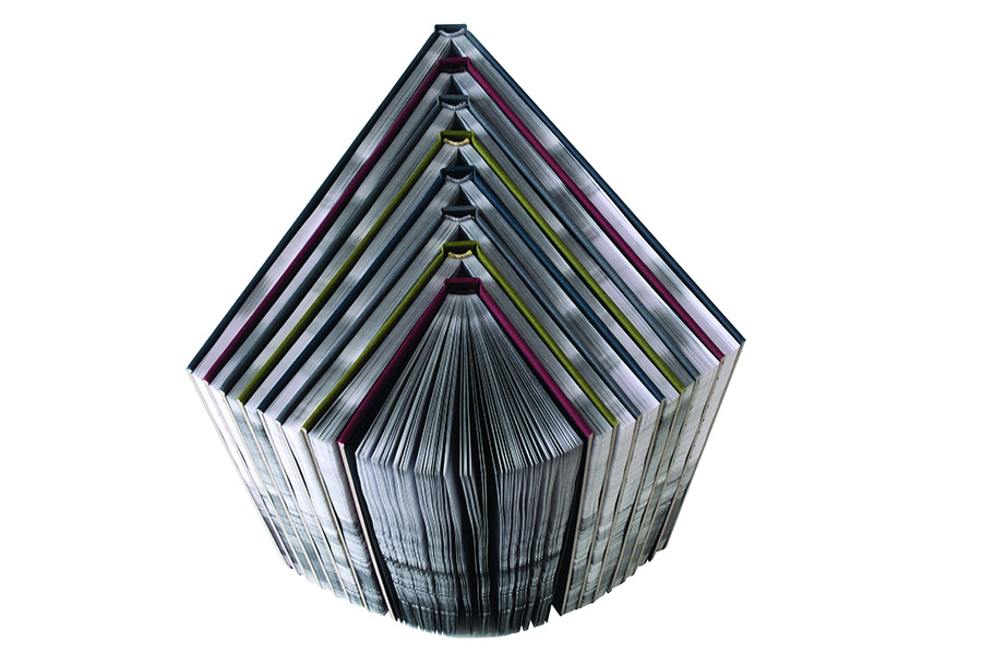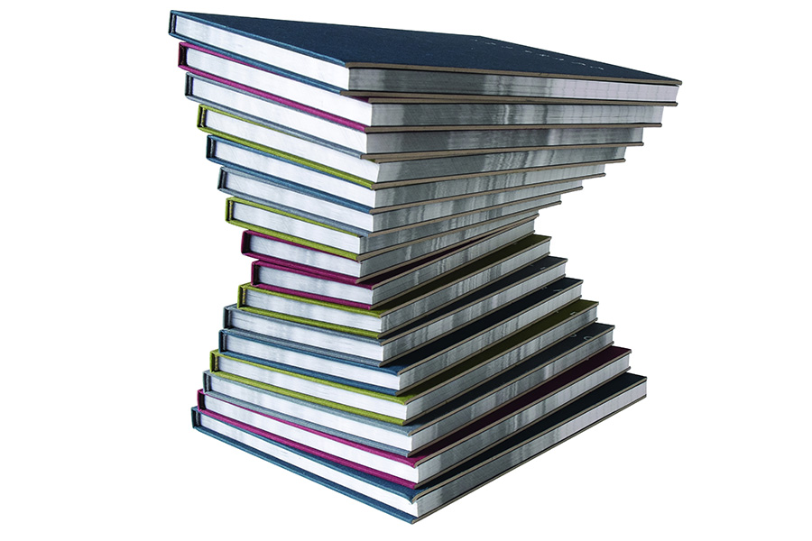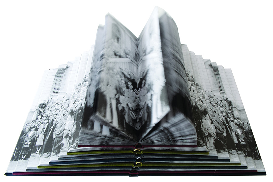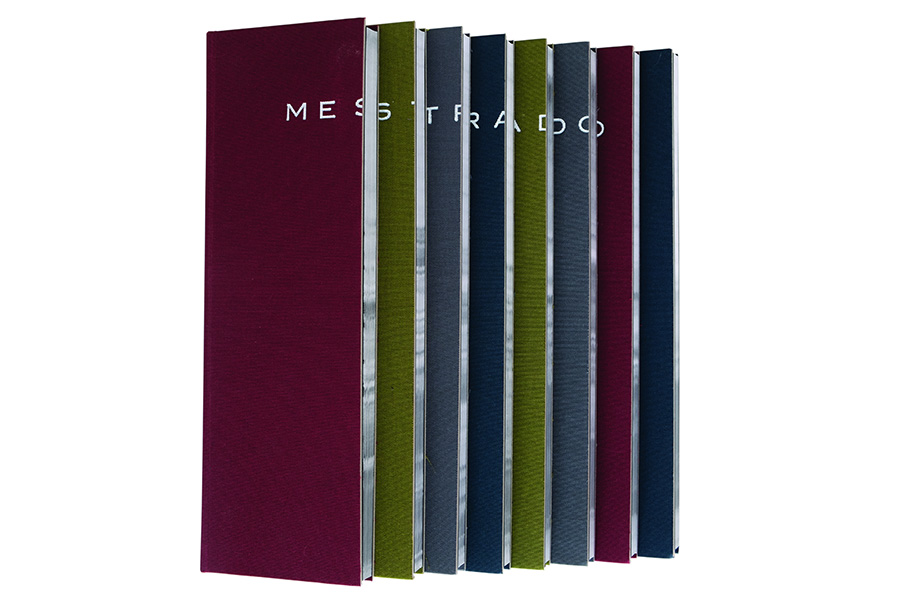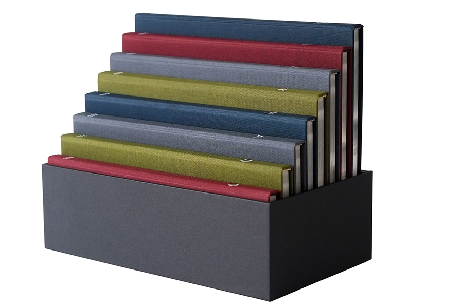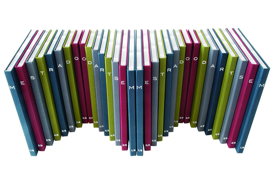 Abstract: Mestrado (Masters) is a book set made of eight volumes which repeats the same photograph on every page. Each volume is cut in a different size than the other, cloaked in red, blue, green and gray. It can be exhibited in many ways, using one or more sets of books. Some of these compositions were photographed and edited in this usage handbook, Manual de Uso.