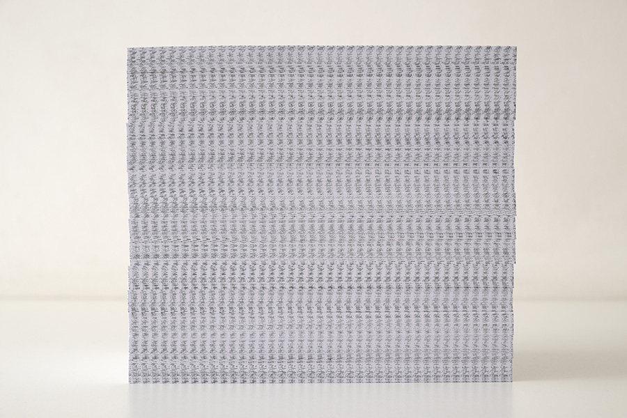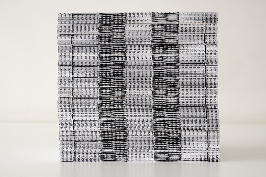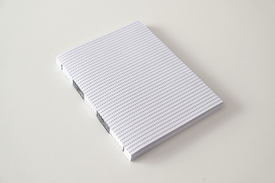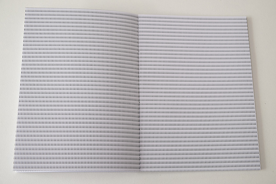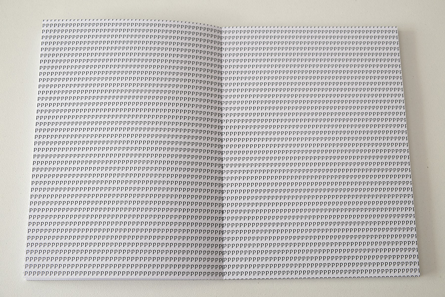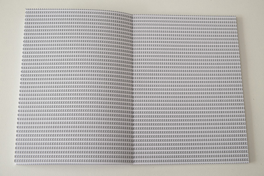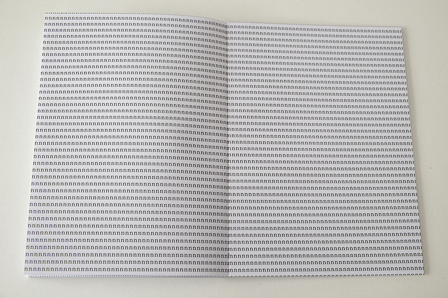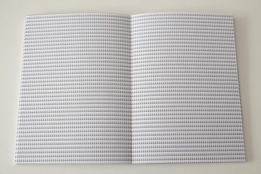 O livro é composto por 11 cadernos de 16 páginas cada. Em cada caderno, uma letra é repetida continuamente formando a frase: "vire a página".