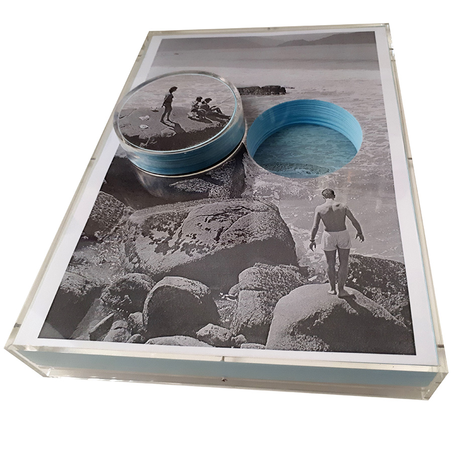 impressão pb digital em sulfite branco e azul furos com faca gráfica caixa de acrílico 22 x 30,5 x 7 cm 3 exemplares + PA 2017 (foto de 1991)