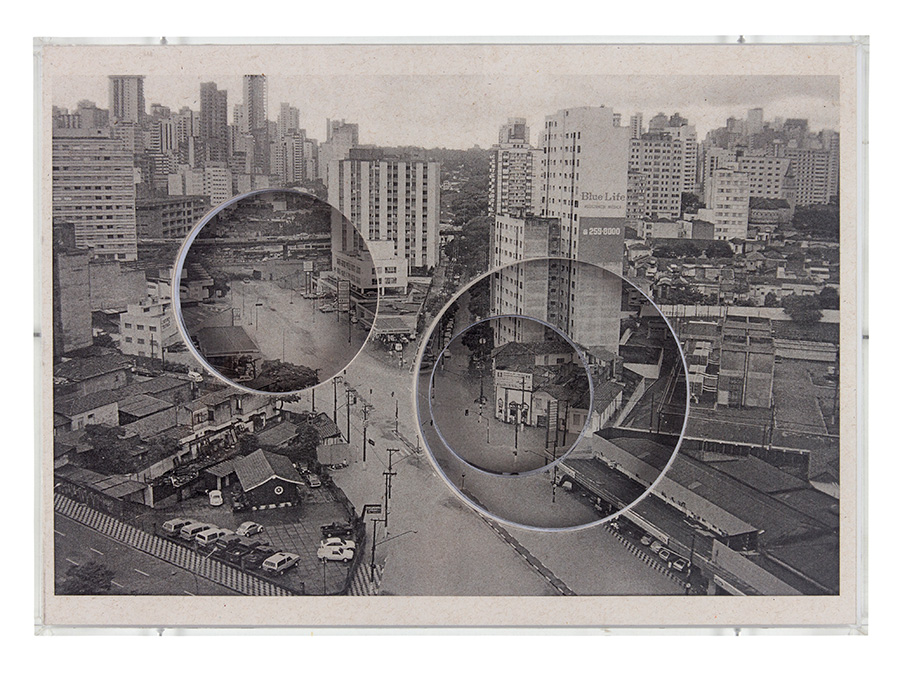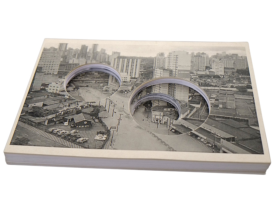 impressão pb digital em sulfite A4 reciclado vários papéis A4 (papéis de rascunho) furos com faca gráfica caixa de acrílico 30 x 22 x 4 cm PA + 2017 (foto de 1993)
