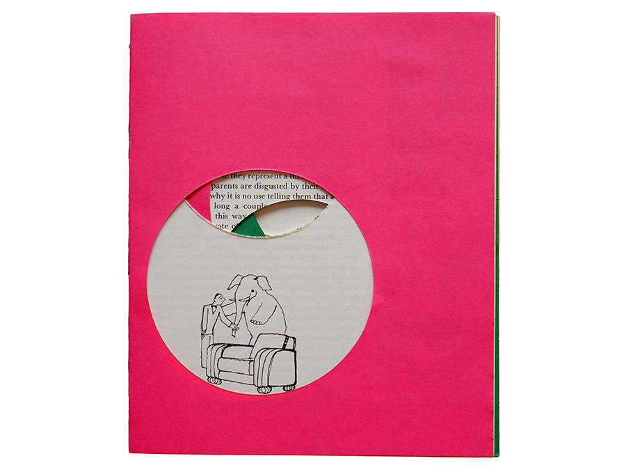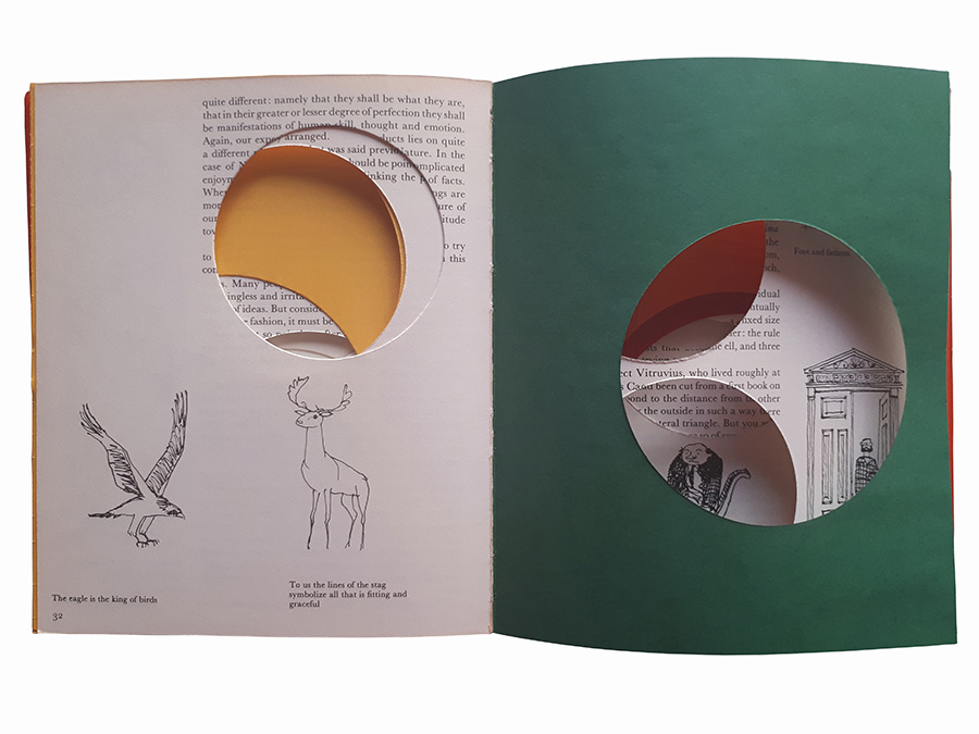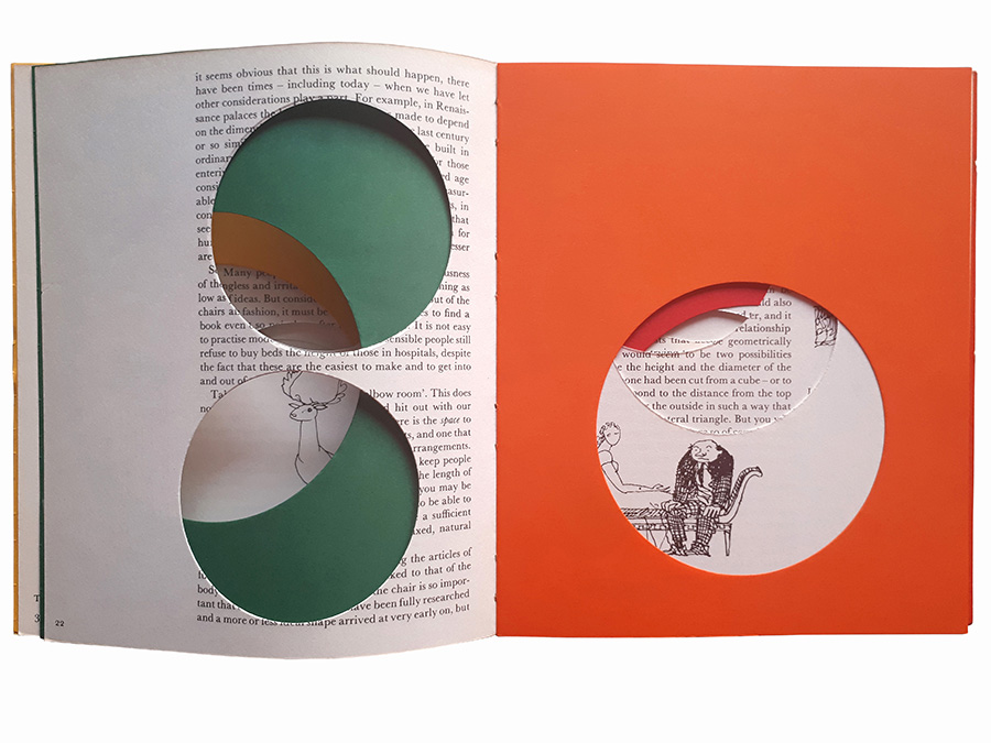 livro descosturado, furado, recosturado em nova ordem com páginas coloridas furadas intercaladas fechado 16,5 x 19,7 x 0,8 cm