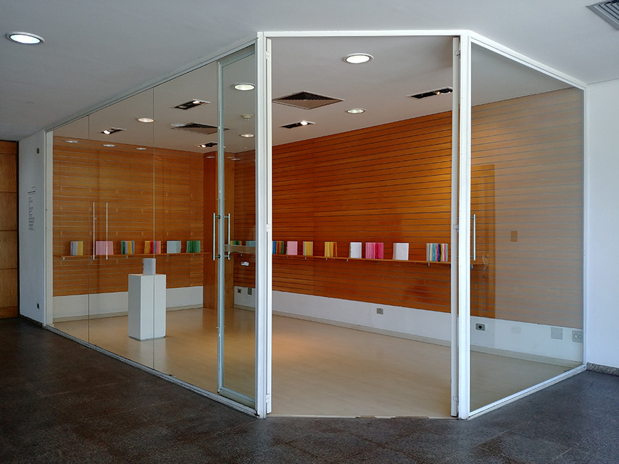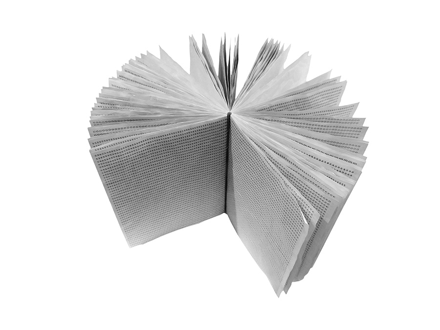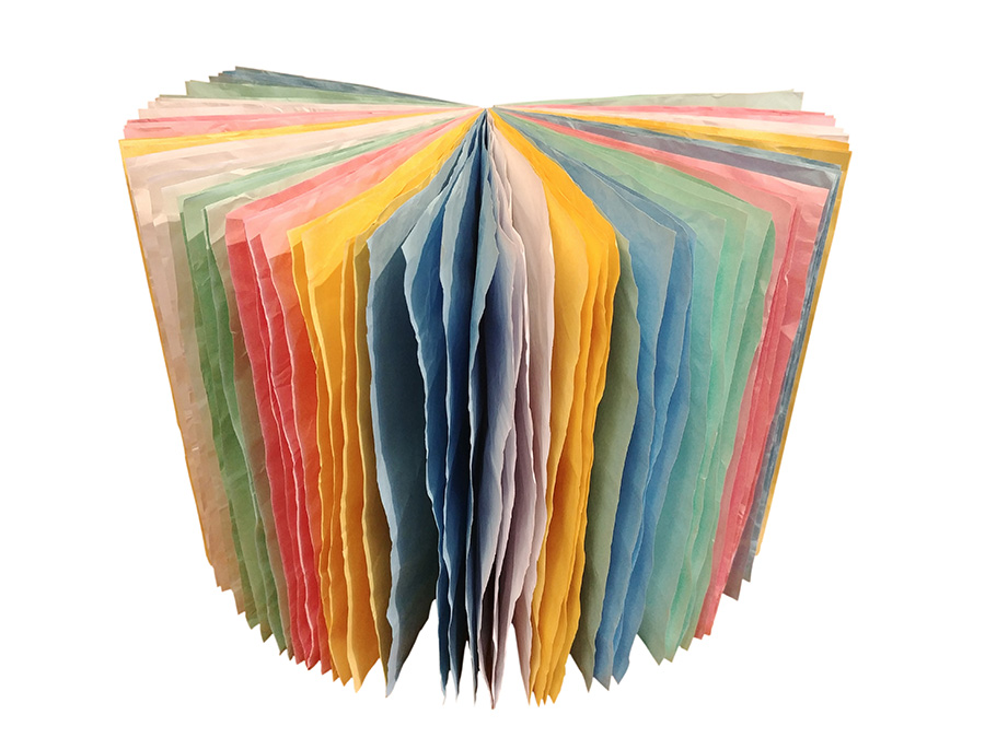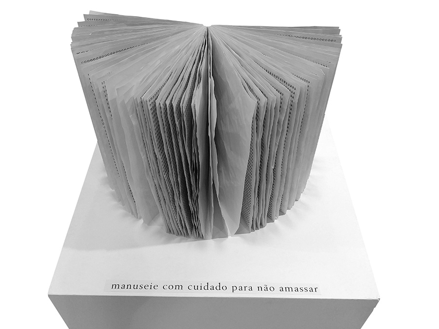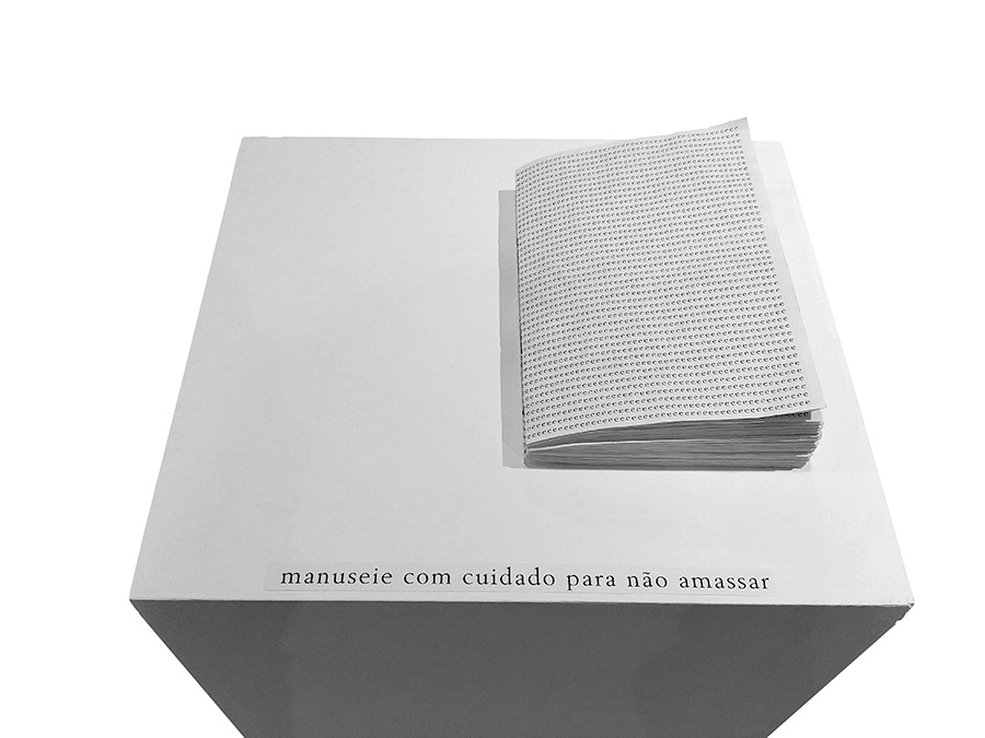 (instalação da exposição Pós-gráfica ECA/Eda/USP)Papel sulfite de várias cores amassado e desamassado, costura manual.17 livros sem texto, 1 livro com texto21 x 15 cm cada volume(video com o livro que tem texto)2019